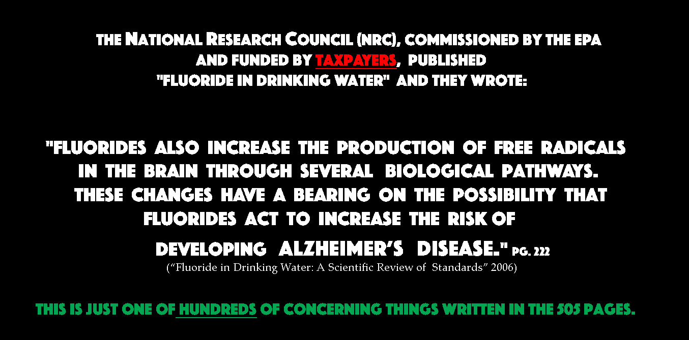"Fluorides also increase the production of free radicals in the brain through several different biological pathways. These changes have a bearing on the possibility that fluorides act to increase the risk of developing Alzheimer’s disease." (Pg. 222 Fluoride in Drinking Water: NRC 2006) |